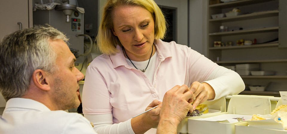 Wir fertigen viele der prothetischen Arbeiten ohne lange Wege in unserem praxiseigenen zahntechnischen Labor an. Das bedeutet für unsere Patienten nicht nur eine ständig überprüfte Qualität, sondern auch eine individuelle, direkte Zusammenarbeit mit dem Behandler wie auch dem, Zahntechniker. Vor allem für die Farbauswahl, Formgebung und Zahnstellungskorrekturen, aber auch beispielsweise bei besonderen Bisslagen ist dies von großem Vorteil.